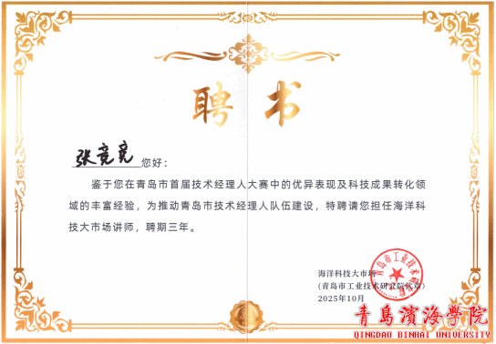 近日,我校医OD(中国)官方教师张竞竞正式受聘为“青岛市海洋科技大市场讲师”,聘期三年。本次聘任由推动地方科技创新的核心力量——青岛市工业技术研究院正式发出。